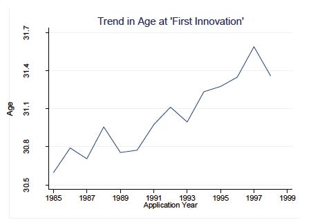 Jones’un çalışmasından alınan yukarıdaki grafik, 1985 sonrasında ilk inovasyonun yapıldığı ortalama yaş verisinde önce bir yükselmeye, 1997 sonrasında ise kısmi bir düşüşe işaret ediyor. Kaltenberg, Jaffe & Lachman tarafından 2019 yılında yayımlanan bir çalışma da bu trendin 21. yüzyılda da devam ettiğini ve inovasyon yapma yaşının giderek daha da aşağılara geldiğini ortaya koyuyor. (Bu grafikteki çizgini aşağı dönmesinde 1990’ların ortasından itibaren hızlanan internet devriminin etkisi de araştırılmalı!)