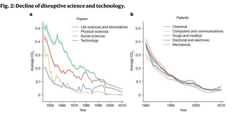 Kaynak: Park, Leahey & Funk, 2023 Yukarıdaki grafik, son altmış yılda 45 milyon makale ve 3.9 milyon patenti inceleyen Nature Dergisi’nde yayımlanan bir araştırmaya ait (Park, Leahey & Funk, 2023). Buna göre bilimsel çalışmaların giderek daha fazla geçmişteki bulgulara dair argümanları desteklediğini, yeni fikirlerin ise daha az görüldüğünü ortaya koyuyor.