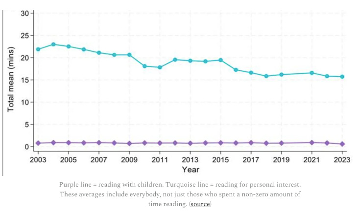 Peyami Safa şöyle der: “Kitaplarla dostluk, her zaman insanı yüceltir ve insanı ilerletir.” Peki, son dönemde ne kadar okuyoruz? Yukarıdaki grafiğe göre ABD’de kitap okumada esas düşüş 2010’larda olmuş. 2023 itibarıyla günlük ortalama 15 dakika.