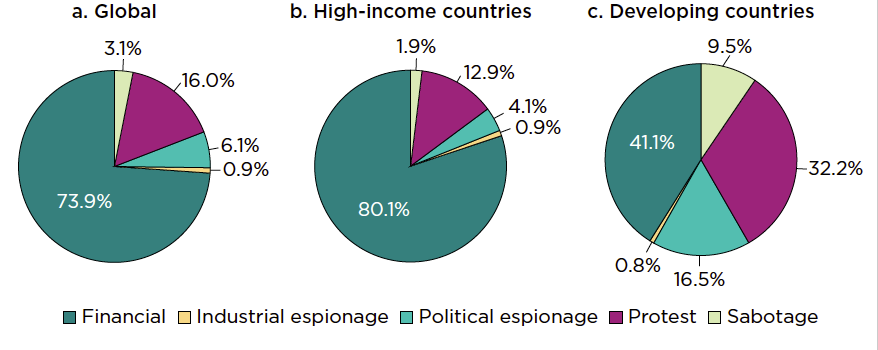 Gelişmekte olan ülkelerde, zengin ülkelerin aksine, siber saldırıların çoğu seçimlere müdahale, siyasi gündemi etkilemek, devlete güveni sarsmak gibi siyasi saiklerle yapılıyor.