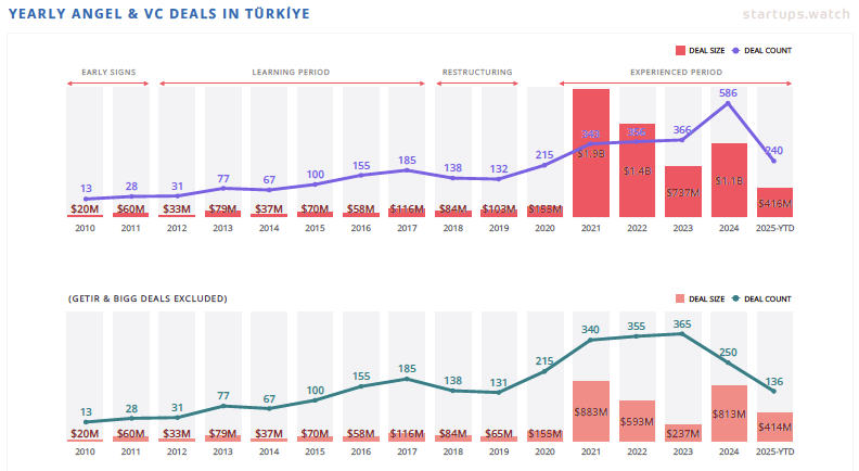 Getir’in aldığı yatırımlar ve BiGG Fonu’nun etkisi çıkarıldığında 2021-2024 döneminin ortalaması $631 milyon milyon. Son çeyrekteki performansa bağlı olarak 2025 yılında bu ortalamayı yakalamak mümkün olabilir. Üçüncü çeyrek performansı iyi ama yılın ilk yarısı pek de iyi geçmedi.
