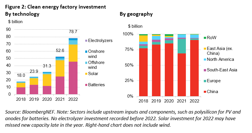 İmalat yatırımlarında güneş enerjisi teknolojileri ve bataryalar baskın. Coğrafi kırılımda da bu sektörlerde dominant olan Çin’in hakimiyeti oldukça çarpıcı.