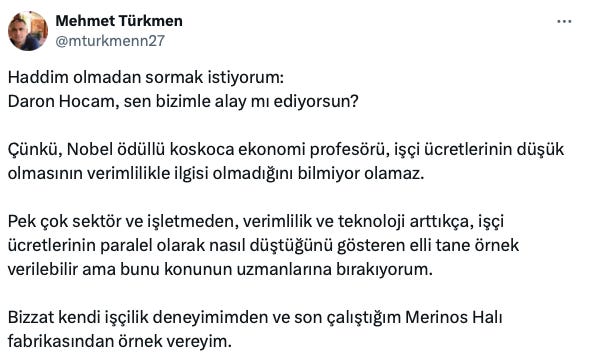 Bu hafta gündem, Daron Acemoğlu Hoca’nın Fatih Altaylı ile yaptığı söyleşideki sözleriydi. Mealen, Türkiye’de verimlilik artmadan sorunların çözülemeyeceğini, ücret artışlarının tek başına zenginlik getirmeyeceğini söylemişti.