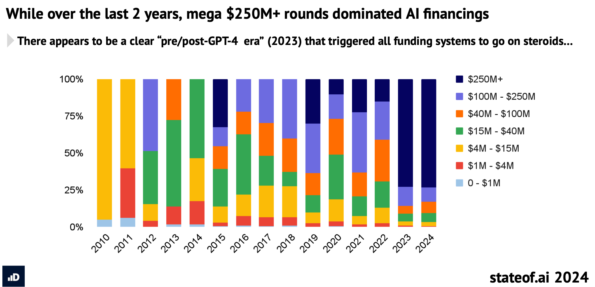 Girişim sermayesi yatırımları 2023’ten beri ekseriyetle çok fon yatırımı alan şirketlere gidiyor. Yani bir seferde yapılan yatırım miktarı artıyor. Pasta büyük dilimler halinde az sayıda şirket tarafından paylaşılıyor. Yapay zekâ şirketi kurmak ve büyütmek ŞU AN zor iş.