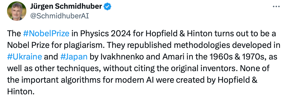 İddianın sahibi yine yapay zekâ alanındaki çalışmaları ile bilinen Alman bilim adamı Jürgen Schmidhuber. Schmidhuber’e göre Hinton ve Hopfield, 1960’larda ve 1970’lerde Japon ve Ukraynalı bilim adamlarının geliştirdikleri metodolojileri çalışmalarında referans vermeden kullanmış.